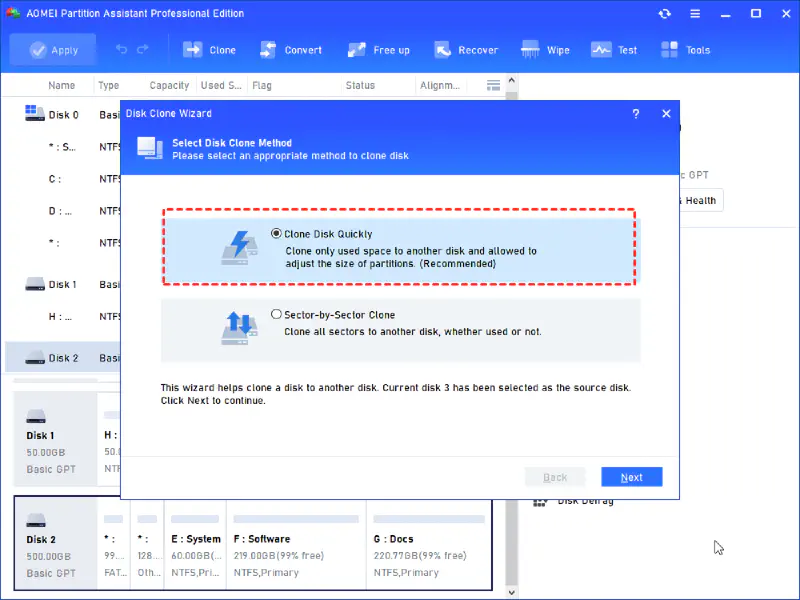 Terdapat pilihan metode untuk kloning disk. Jika size SSD lebih kecil dari HDD maka pilih Clone Disk Quickly