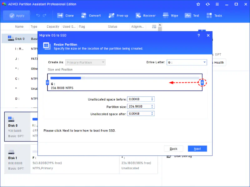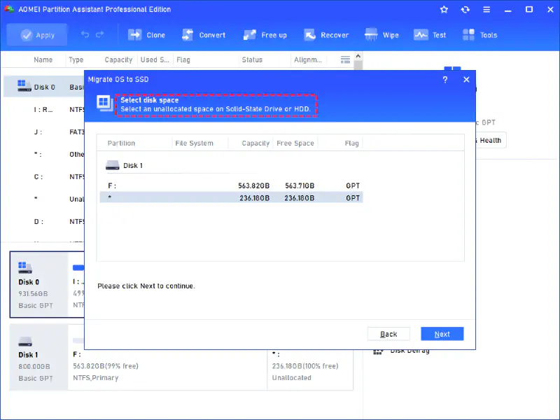 Pilih unallocated space pada SSD tujuan dan klik Next